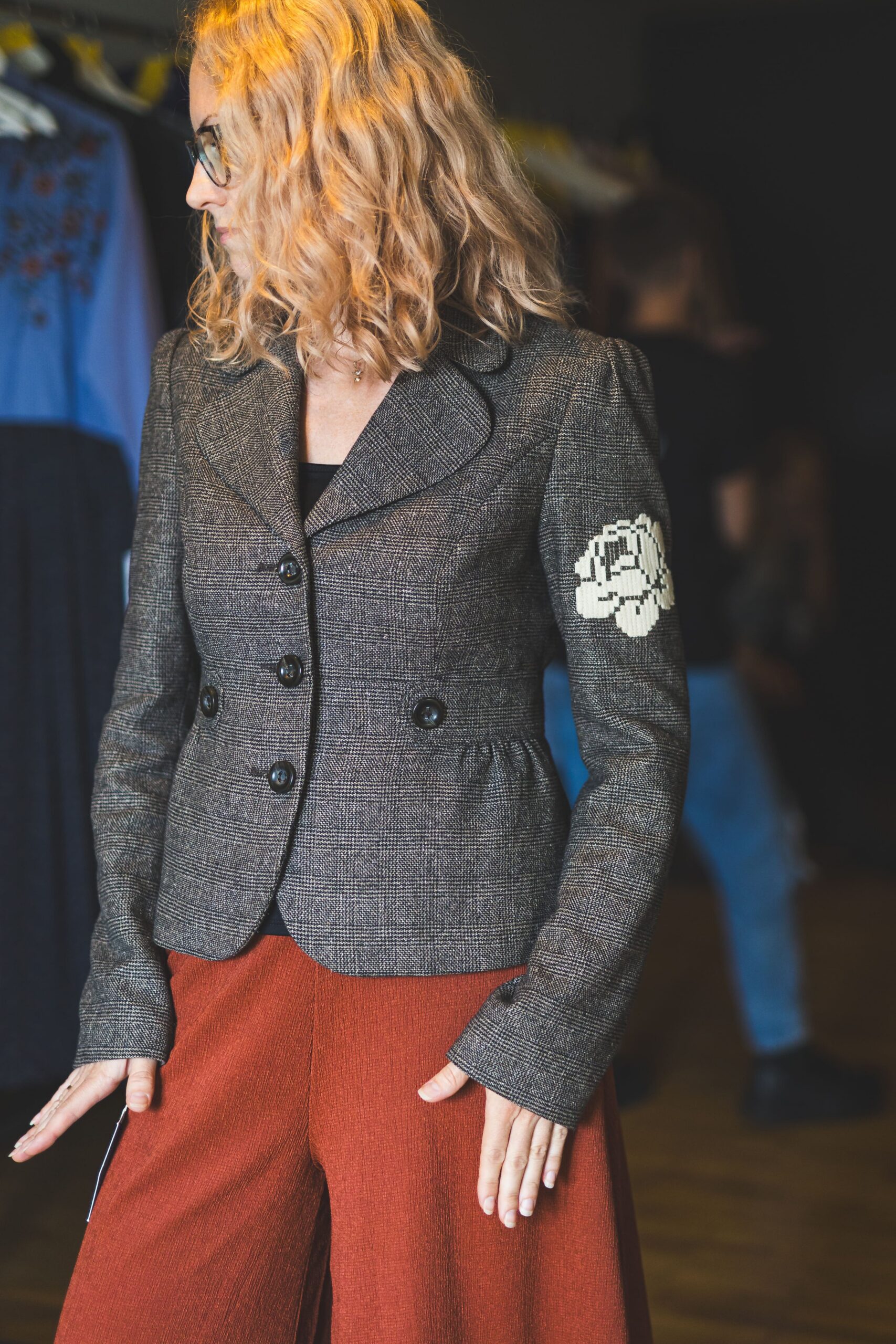 Väärikas villane jakk GEMMA sai uue elu läbi Katré rooside. Jakil on vooder, mis teeb keerulisemaks rooside õmblemise, eriti varrukale.